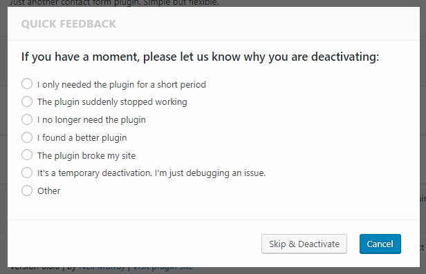 We were recently advised that Freemius Insights, a 3rd party library used by Contact Form 7 Skins (since v1.2.2) to implement opt-in data collection, has a severe security vulnerability. You need to update to Contact Form 7 Skins v2.1.1 (or higher) IMMEDIATELY – to avoid your sites remaining vulnerable. We’ve removed Freemius from Contact Form…