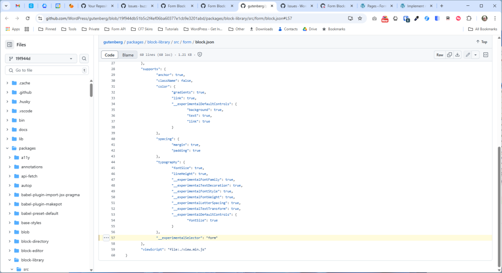 The line “__experimentalSelector”: “form” in the block.json file for the Form block in the Gutenberg editor, is a special property that defines the CSS selector used for the block’s wrapper element. It defines an experimental feature that allows targeting the HTML form element rendered by the block in the editor’s styles.