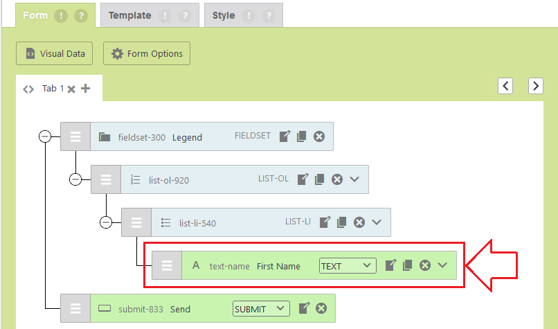1- First locate the desired field i.e. identify the field you want to duplicate within the Visual Editor. This can be a single text field, a dropdown menu, checkbox, or even a group of fields. Here, we want to duplicate the field “First Name”.