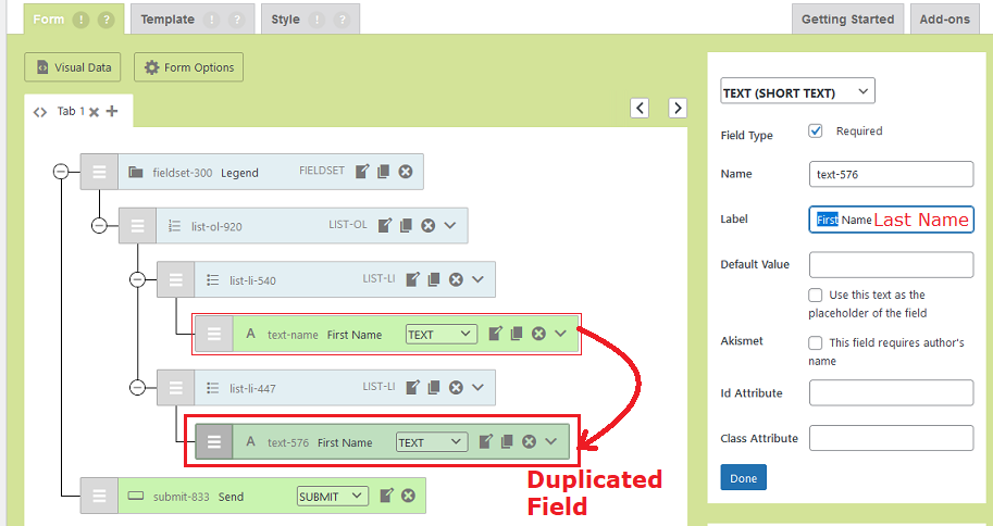 For example, in the above screenshot, you just created a duplicated field for the “First Name”, to change it as required, first edit this newly duplicated field, and then simply change the word First with Last.