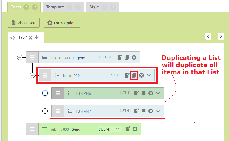 The duplicate icon is your friend for form elements. There are a couple of reasons where the duplicate icon can be used for various form elements within the CF7 Skins Visual Editor: